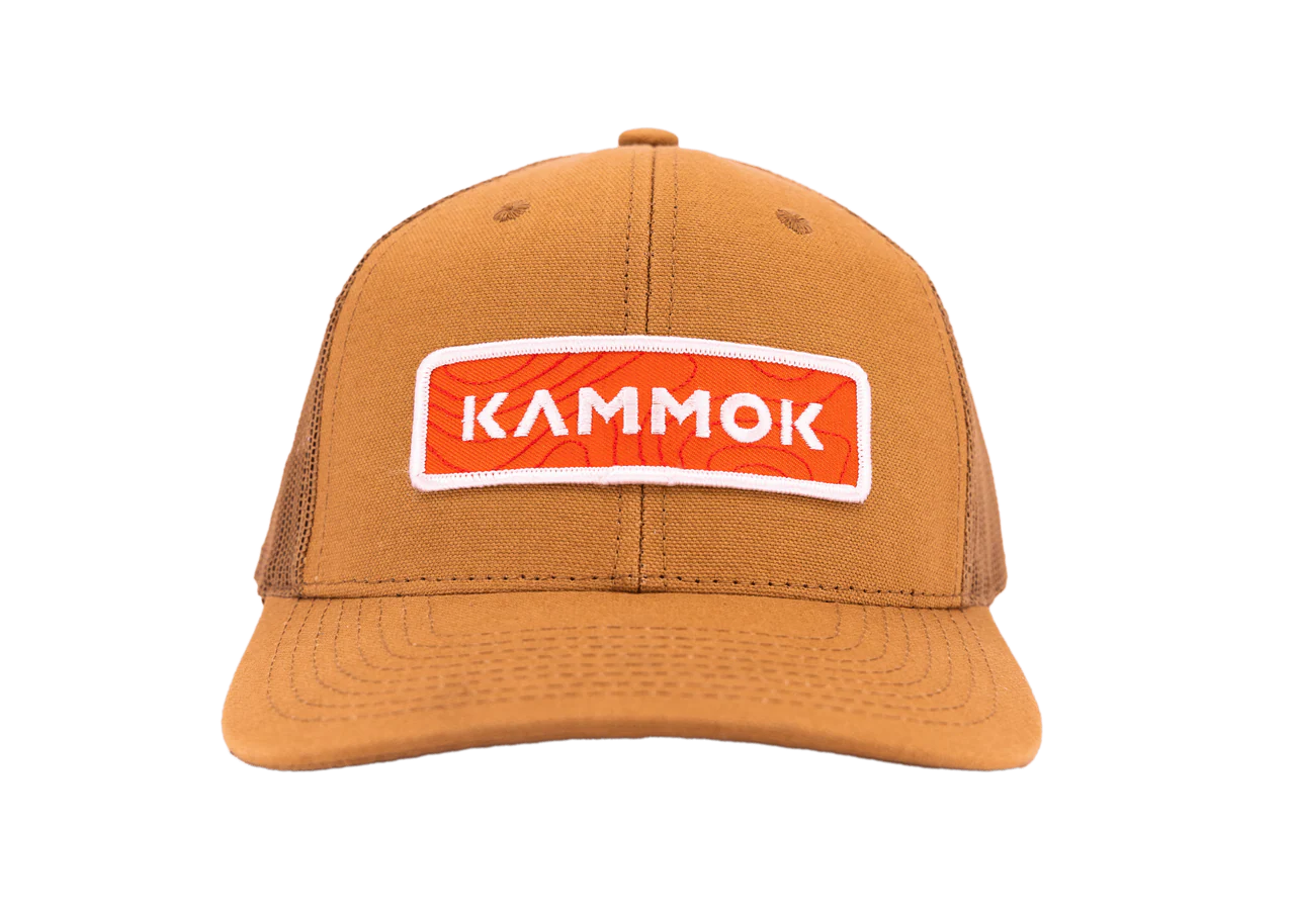 It is a 6-panel trucker hat featuring a mesh back, an embroidered patch, and an adjustable strap for closure.